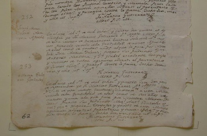 #5 – In 1804, Antonio Narbona and his wife Ysabel Escalante (4th great-grandparents) baptized an Apache boy they named Jose Maria Dolores Narbona. The boy was baptized in the Tumacácori church. The Narbona’s lived in Tubac. These towns are now in Southern Arizona.