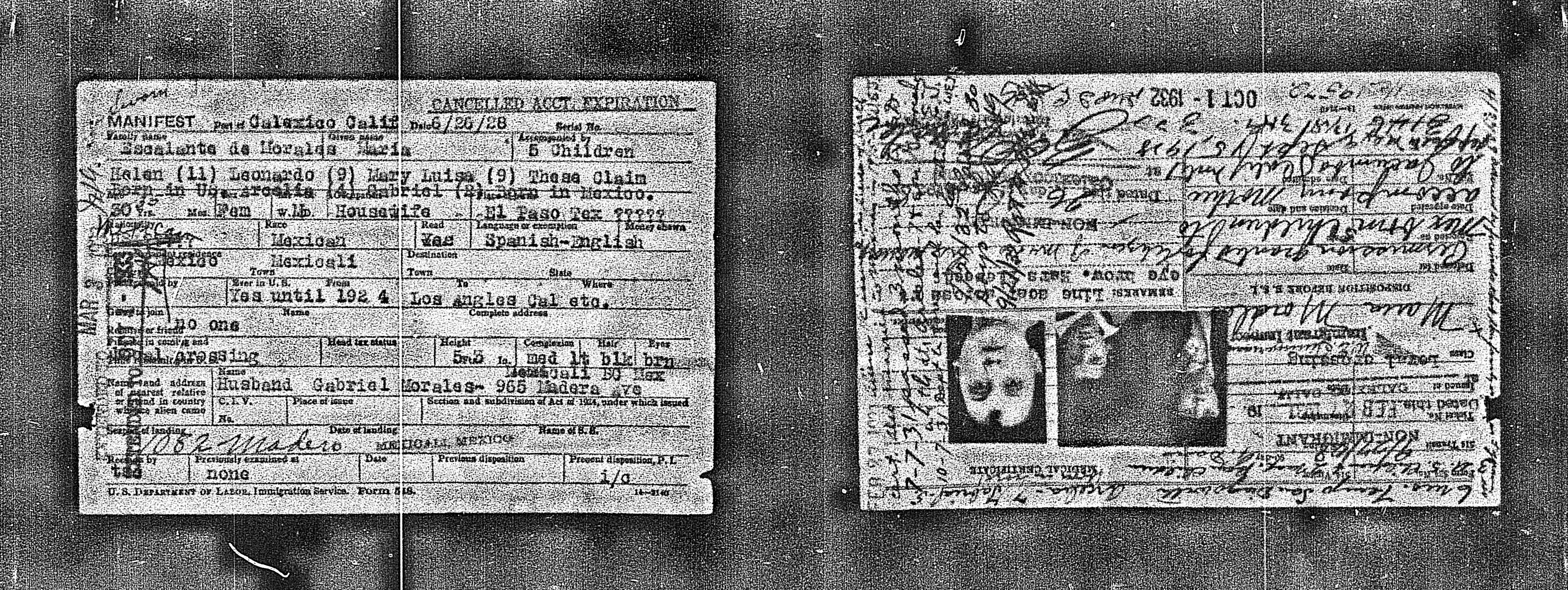 The two settled into domestic life and started having children. According to her Travel Manifest, dated 1928, her children were born: Helen (1917), Leonardo and Mary Luisa (1919), Arcelia (1924), and Gabriel (1926). She and her husband live in many different places, including Los Angeles, Mexicali, Jacumba, CA.