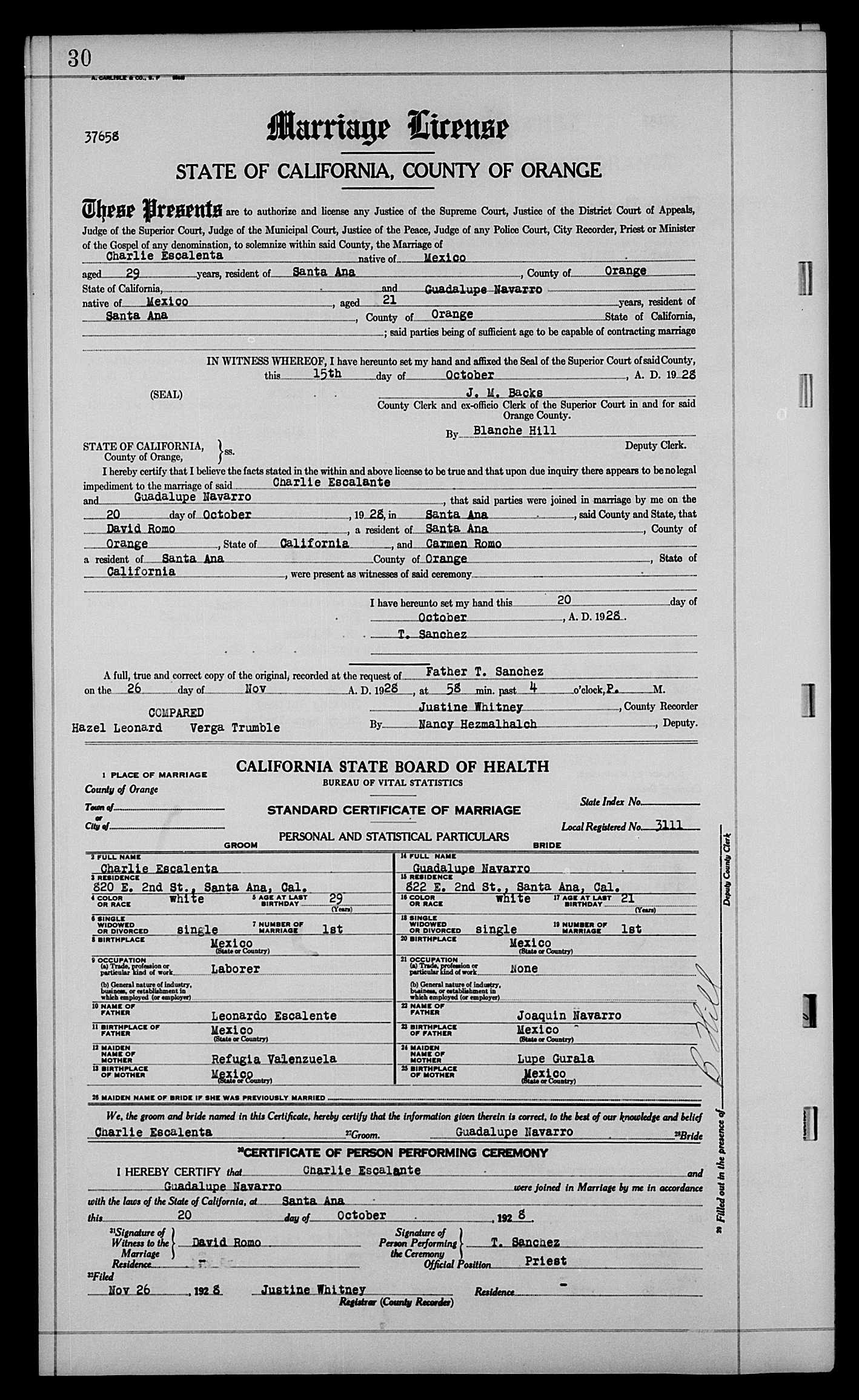 I’m also happy to report that one of many of Uncle Charlie’s mysteries has been uncovered. For me, his love of, and devotion to the Romo family has never ben doubted. After Rufina died, he moved back to Santa Ana, CA. In 1928, he lived at 828 2nd Street. He met the nice girl next door, Guadalupe Navarro. They got married! While I knew this, I now have dates! I have witnesses! David, Jr. and Carmela Romo. And we also learn that Tia Lupe had parents! Joaquin Navarro and Guadalupe Gurrola. They came from Suaqui Grande, Sonora, Mexico.